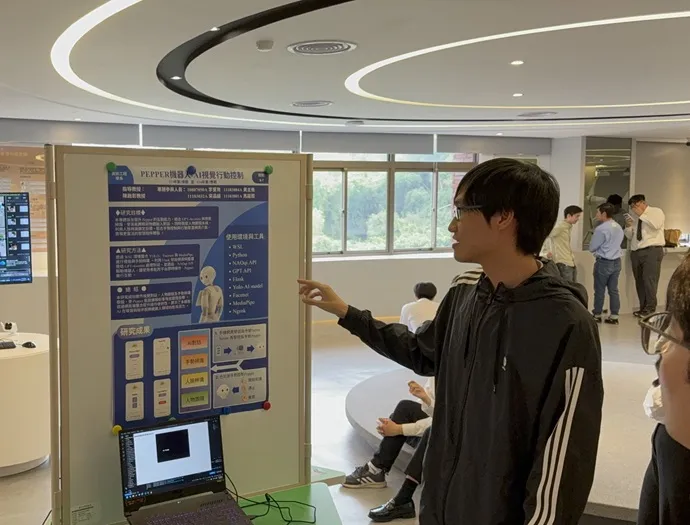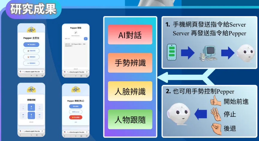 本專題以GPT-4o-mini作為Pepper的語言中樞來處理思考與發言,使Pepper展現出更加生動且豐富的回應。在視覺方面,結合物體辨識與人臉辨識實作出能夠辨識特定人物的人物追蹤系統、手勢控制系統,使Pepper能更靈活的移動並且自然地進行各種對話。